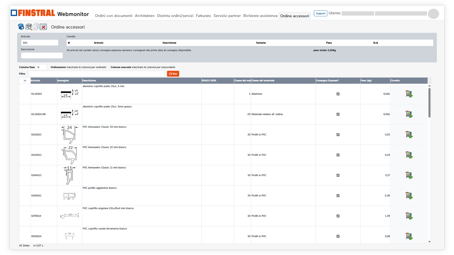 Alla voce di menu “Ordine accessori” possono essere ordinati gli accessori e il materiale di montaggio, i campioni e il materiale pubblicitario.